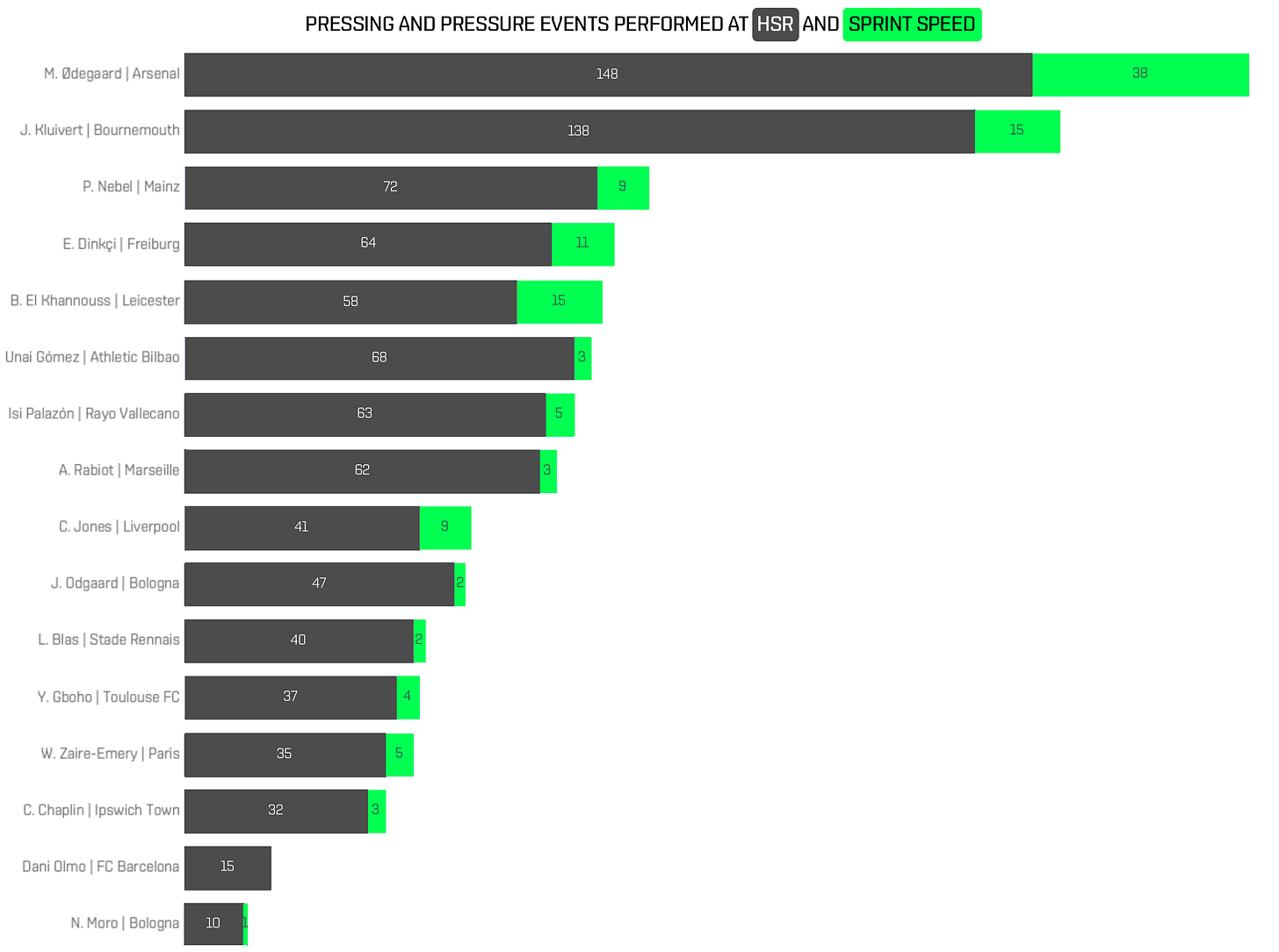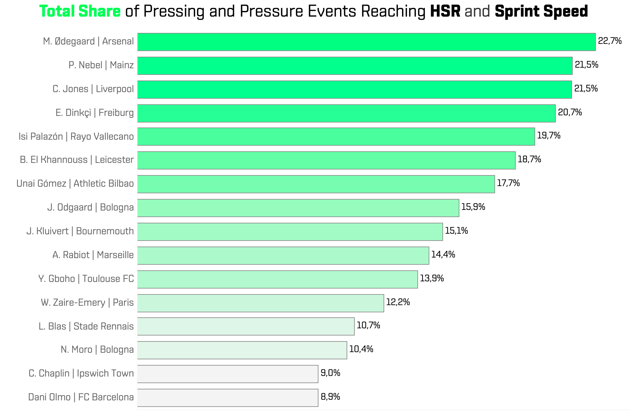22.7% of Ødegaard’s pressing and pressure actions were performed at high-speed running or at sprinting intensity - the highest share among all midfielders in the top 5 leagues with over 500 recorded pressing and pressure events throughout the season.