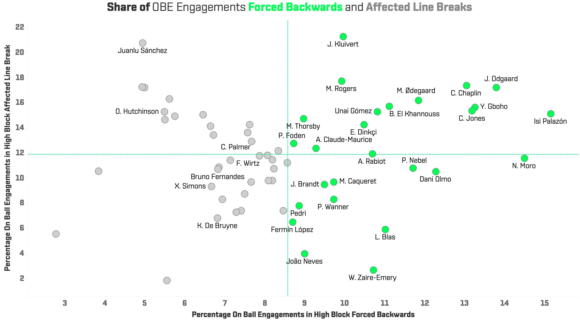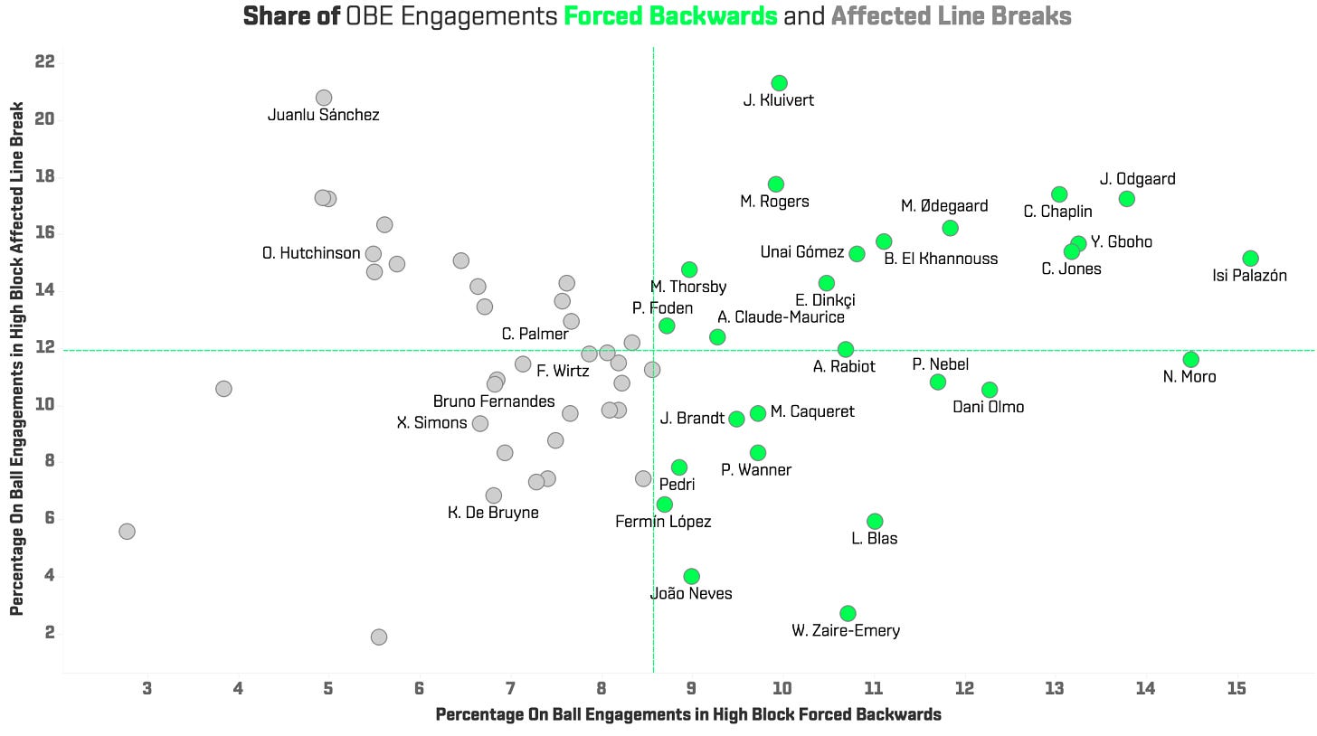 In the scatter plot below, we highlight midfielders with the highest share of On-Ball Engagements in the high block that force the opponent backwards (x-axis) and affect potential line breaks (y-axis).