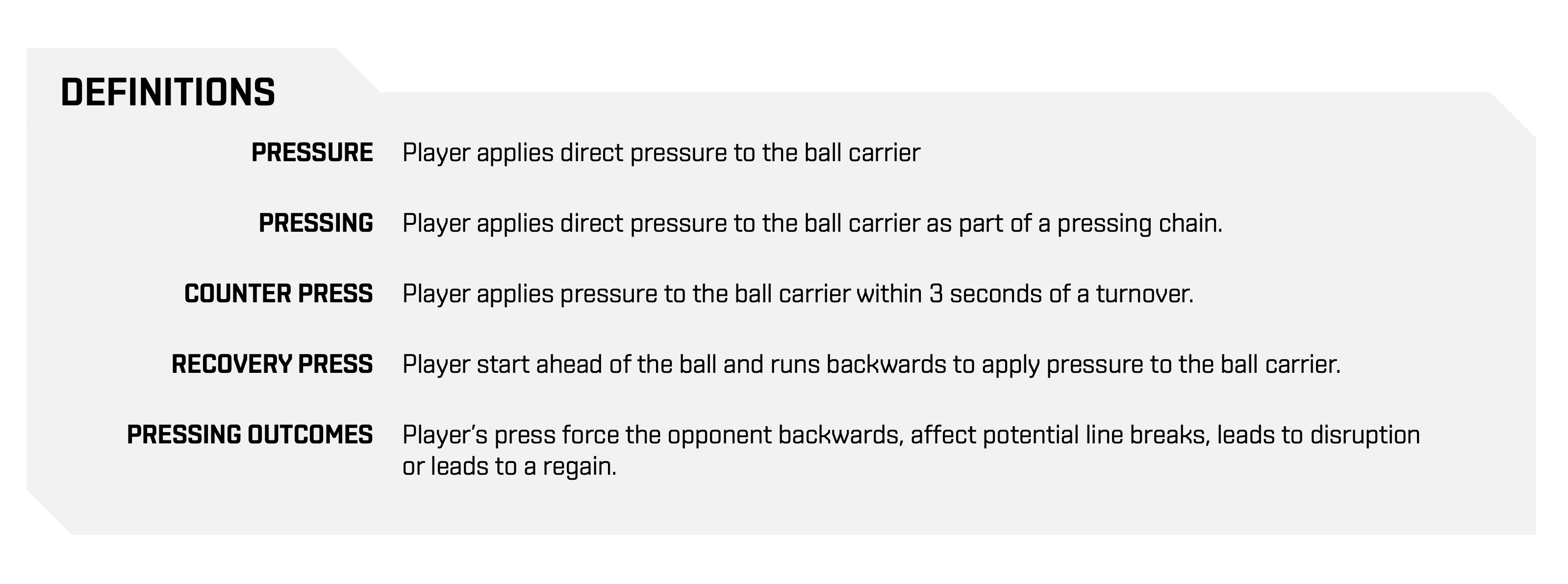 We can measure pressing intensity by benchmarking players based on their ability to perform pressing and pressure engagements at HSR and Sprint speed.