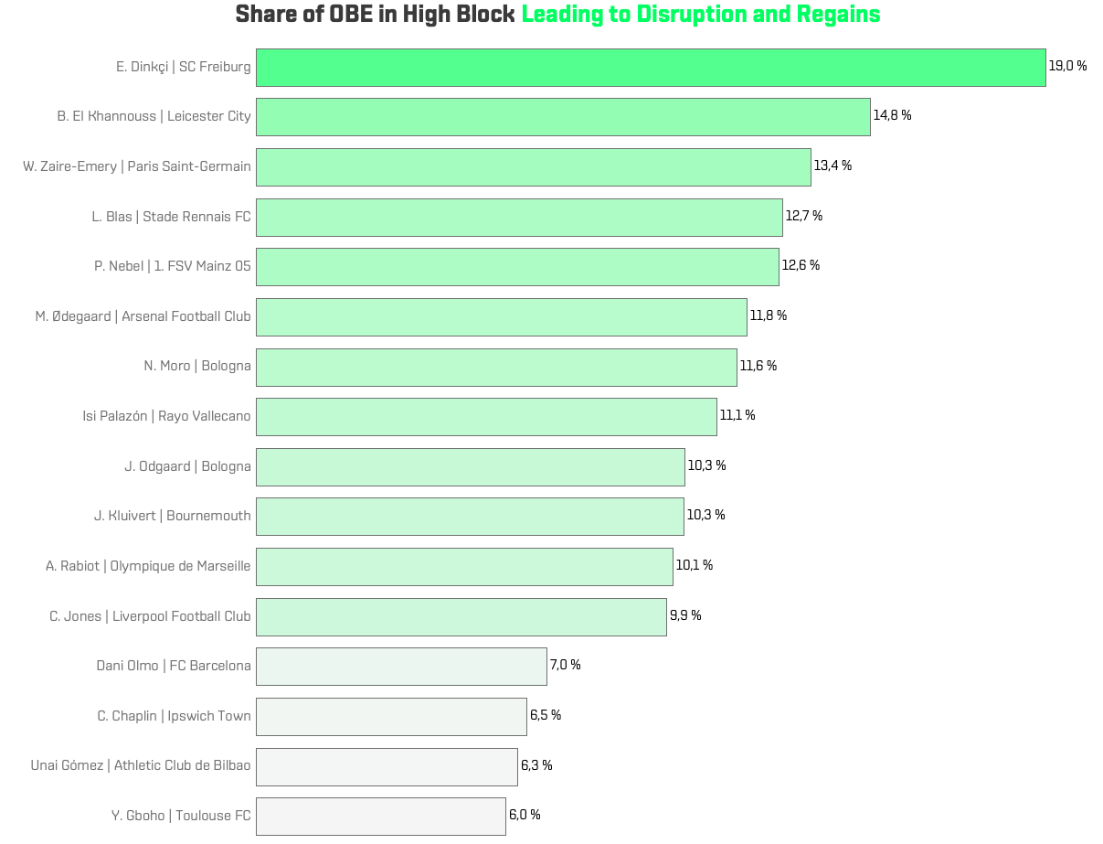 Eren Dinkçi, the 23-year-old attacking midfielder from Freiburg, stands out as the most effective ball-winner among our hunters - with 19% of his on-ball engagements resulting in either a regain or disruption of the opponent’s play. Next on the list, ranking highly again, is top-10 Playmaker Bilal El Khannouss.