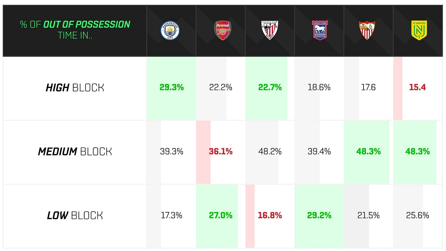 Note that total on-ball engagements include not only pressing and pressure engagements, but also counter-press and recovery press engagements, giving us a more complete picture of their overall defensive engagements.