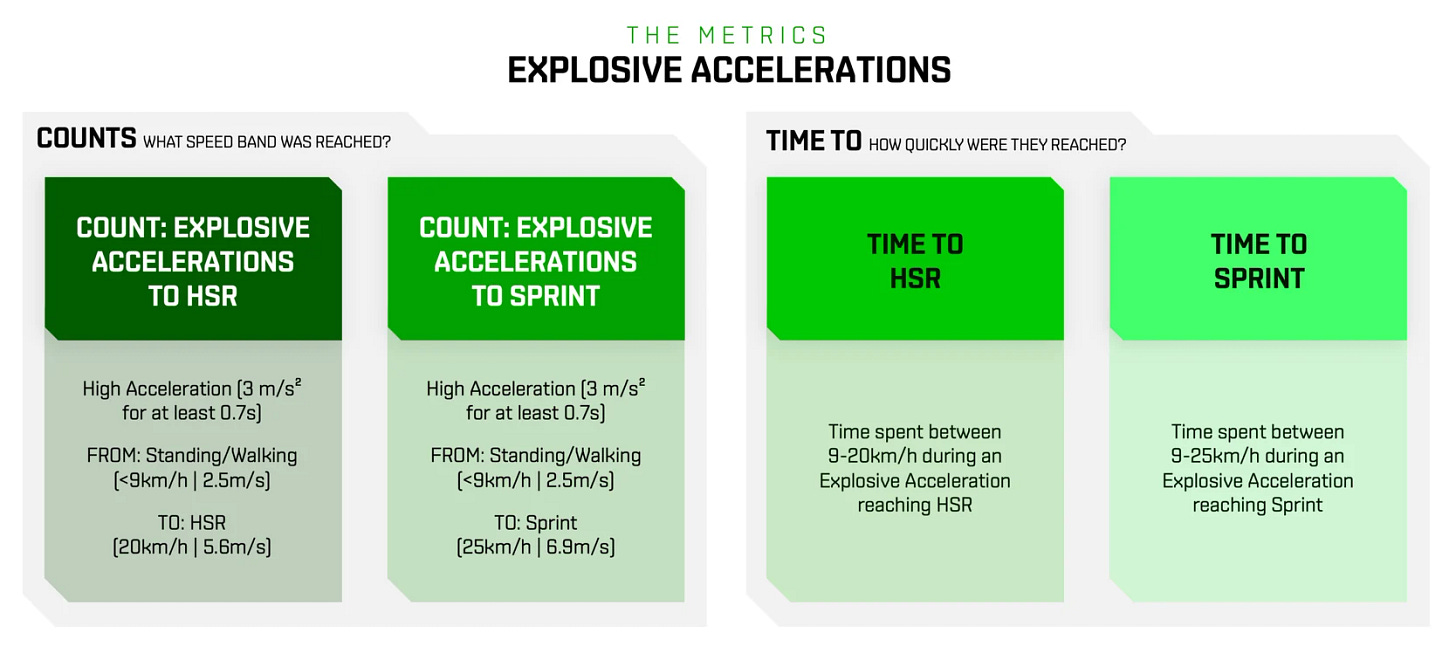 The final element of our physicality profile is explosiveness. With so many physical actions taking place within tight spaces, this short area quickness is just as important as top line speed. We can assess our hunters’ explosiveness by looking at the unique acceleration metrics available within SkillCorner Physical Data: Explosive Accelerations: