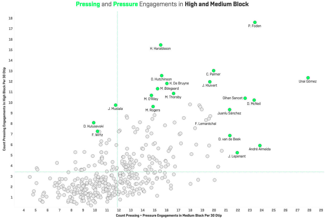 Phil Foden stands out as one of the most active pressers, ranking first for pressing engagements in the high block and third for combined pressures in the medium block. In the medium block, Unaí Gómez (Athletic Club) leads the way in combined pressing and pressure actions. Familiar names like Martin Ødegaard, Cole Palmer, and Kevin De Bruyne also appear prominently. All three play for teams that frequently defend high up the pitch, so their presence here is no surprise.