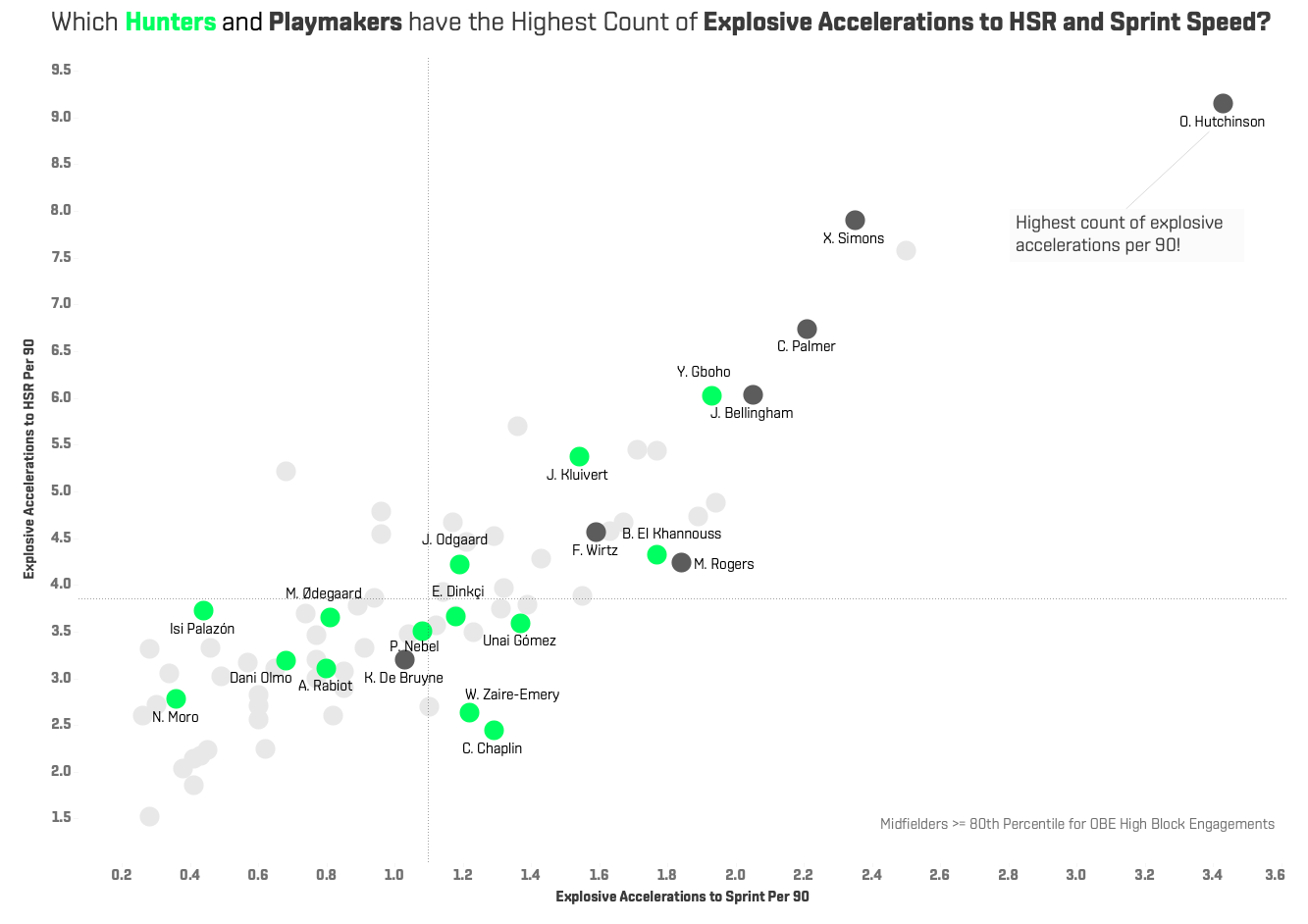 The big outlier, however, is Omari Hutchinson. Despite playing for Ipswich, a team that spends most of its time in a low block, he still ranks top for total explosive accelerations and within the top five in our sample for sprint count per 90. Not only that, Hutchinson is the joint second most explosive player in our sample, together with Xavi Simons, averaging just 1.36 seconds to reach sprint speed.