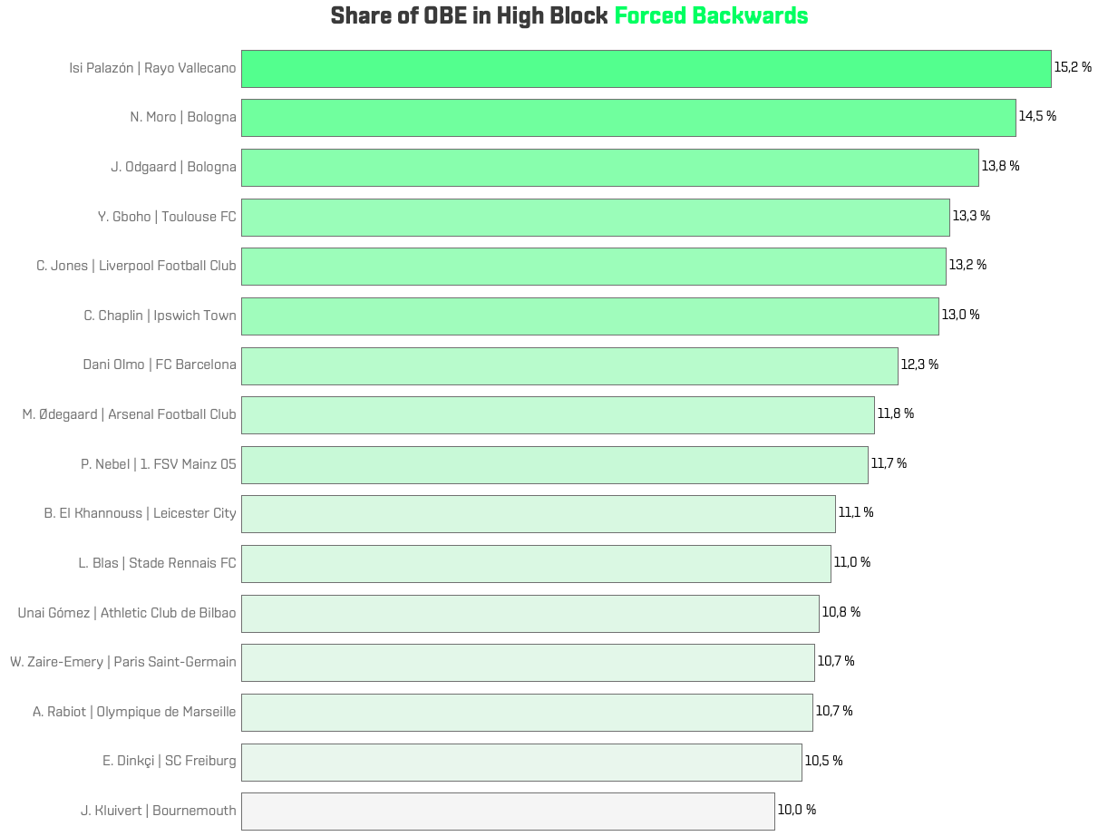 The bar chart below refines our list of hunters by including only midfielders with at least 10% of their high block on-ball engagements resulting in the opponent being forced to play backwards:
