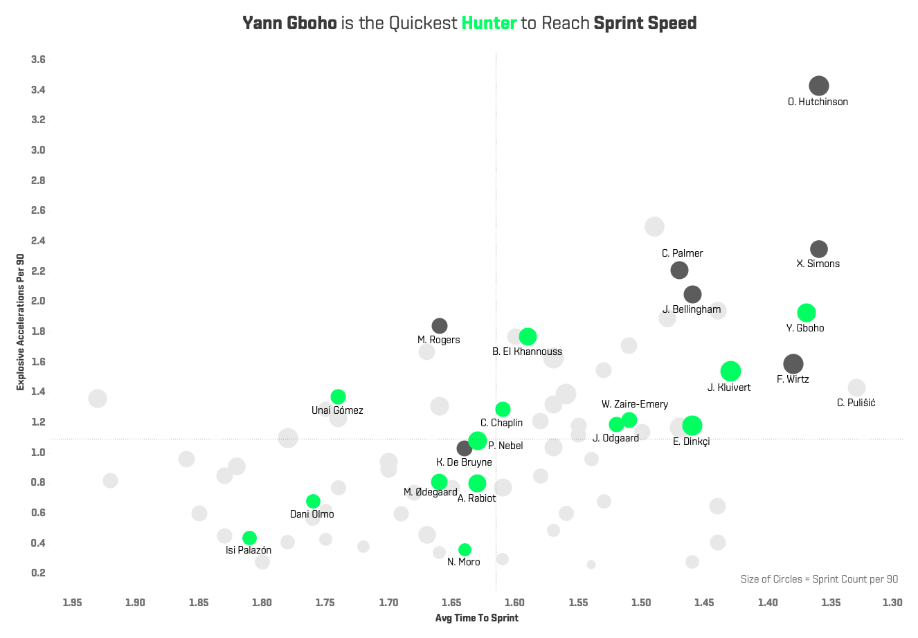 Among our hunters, three players stand out: Yann Gboho, Justin Kluivert, and Bilal El Khanouss. They all demonstrate high totals of explosive accelerations per 90, showcasing their ability to perform repeated sprints. On top of that, Gboho and Kluivert rank among the top five in our sample for time to reach sprint speed – in company with elite playmakers such as Florian Wirtz, Cole Palmer, and Jude Bellingham.