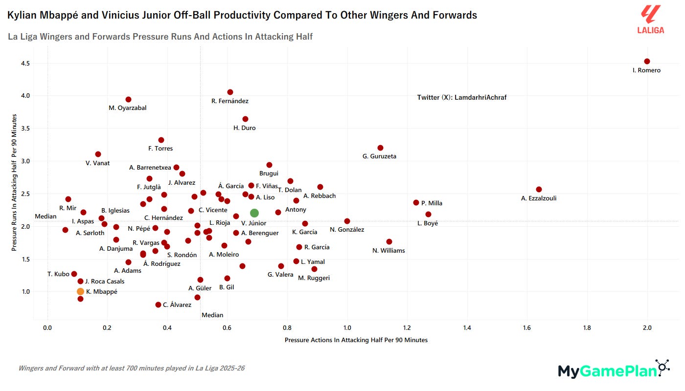 This is how Kylian Mbappé and Vinicius Junior's pressure actions and runs in the final third numbers look compared to their peers in La Liga. While the latter isn’t consistent in maintaining a high level of work rate off-the-ball, the former is nonexistent.