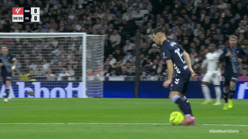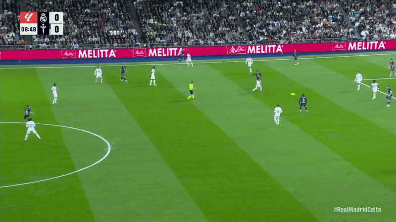 …and expect to survive. The price will be costly. Take this sequence, for instance. The lack of urgency is glaringly clear in Vinicius Junior's run and Celta Vigo’s center-back's ease and comfort in releasing the pass. Tchouaméni’s delayed run, as well, contributes to paving the road for Giráldez’s boys to progress, despite Valverde pointing with his hands to cover the center.